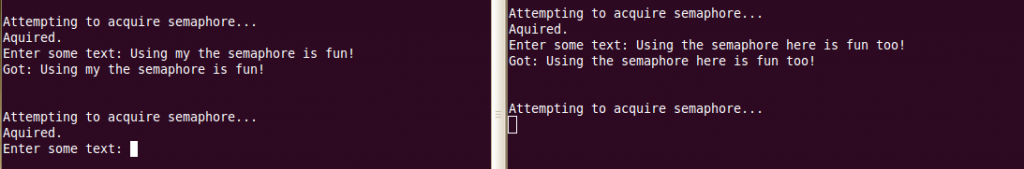 When learning about semaphores, a classic example is to control access to standard input. There honestly isn’t much to the example, so I’ll just give you a quick breakdown of what happens and then let the code do the talking.
